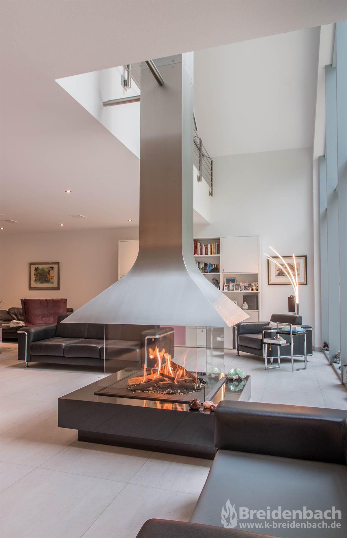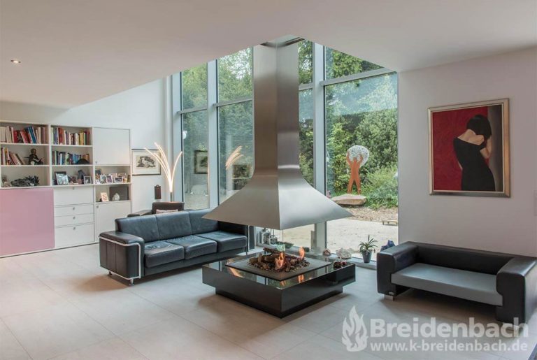 Ein Kamin wird zum Kunstobjekt. Dabei wird die formale Strenge der äußeren Kaminform durch die Wirkung der vielen kleinen und großen Flammen, der Anblick des Feuers und glühenden Holzscheite unterstrichen. Das sind Momente der Meditation, wenn sich nach einer Weile kleine Feuergeister erkennen lassen, die durch die Flammen tanzen.