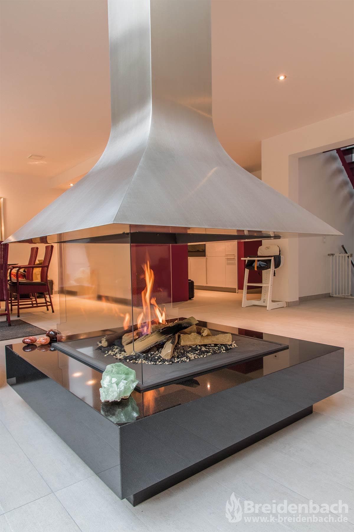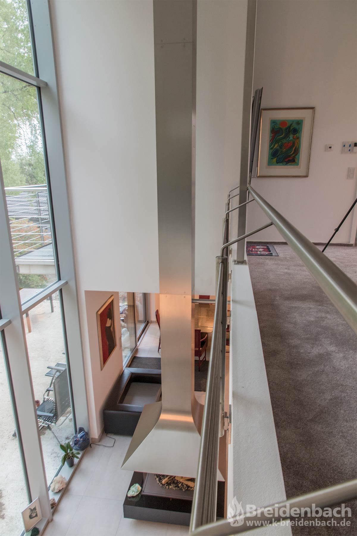 Rundum offene Gaskaminanlage mit Edelstahlhaube und sichtbarem Schornstein.