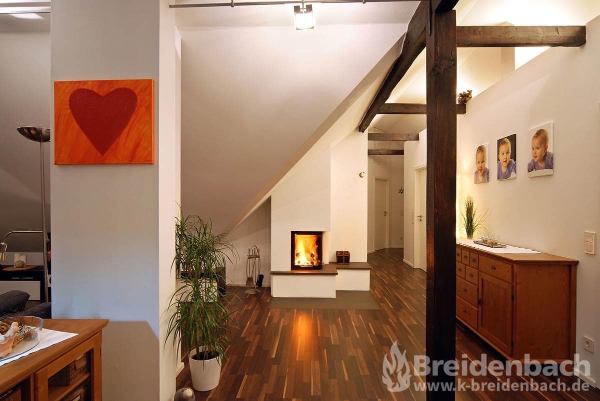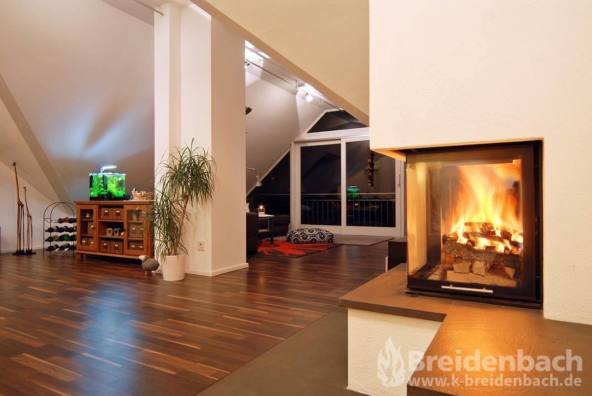 Offene Kamine schickten früher fast 70 Prozent der Wärme einfach durch den Schornstein. Heute hat ein fest eingebauter Kamin von Breidenbach eine Glasscheibe, damit er keinen Sauerstoff aus dem Raum verbraucht und effektiver wärmt. Ein Heizkamineinsatz kann viele Größen und Formen haben und wird individuell ummauert und von Beidenbach mit unterschiedlichen Materialien veredelt.
