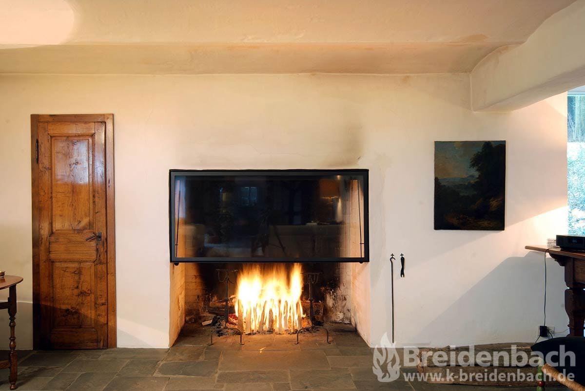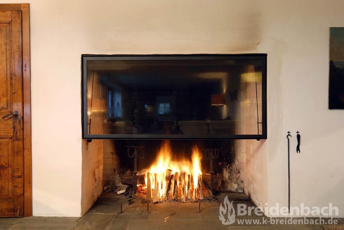 Vorhandene Kaminanlage mit Glas zum Teil geschlossen, um Rauchentwicklung zu vermindern.