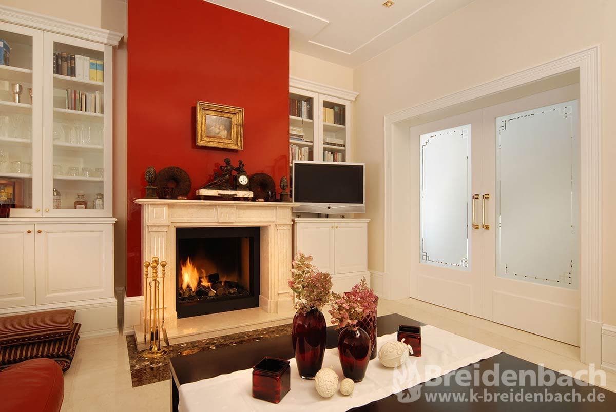 1-seitig offener geschlossener Gaskamin. Stilkaminverkleidung aus Marmor.