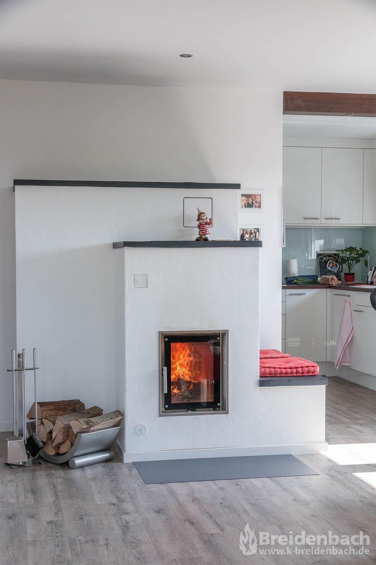 Grundofen mit waagerechten Abdeckungen und Sitzfläche aus Schiefer.