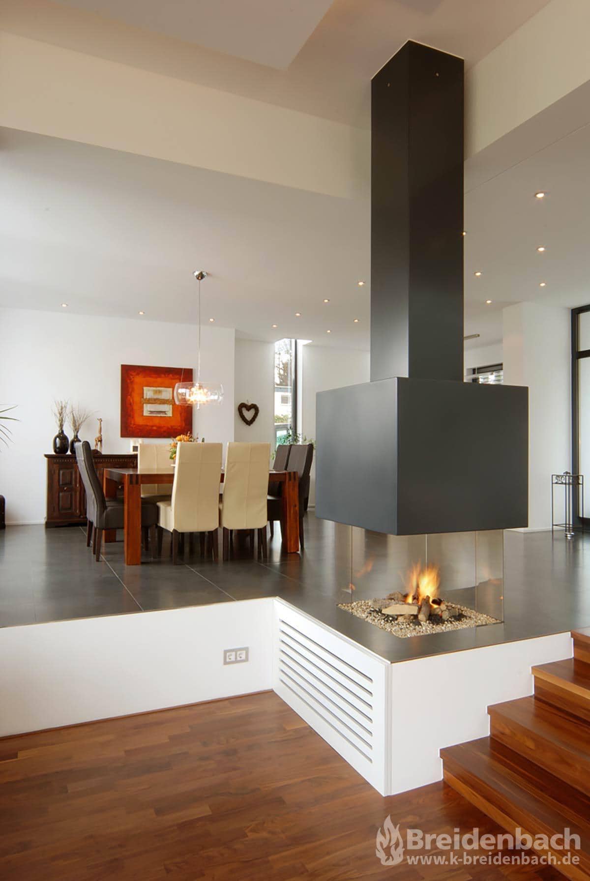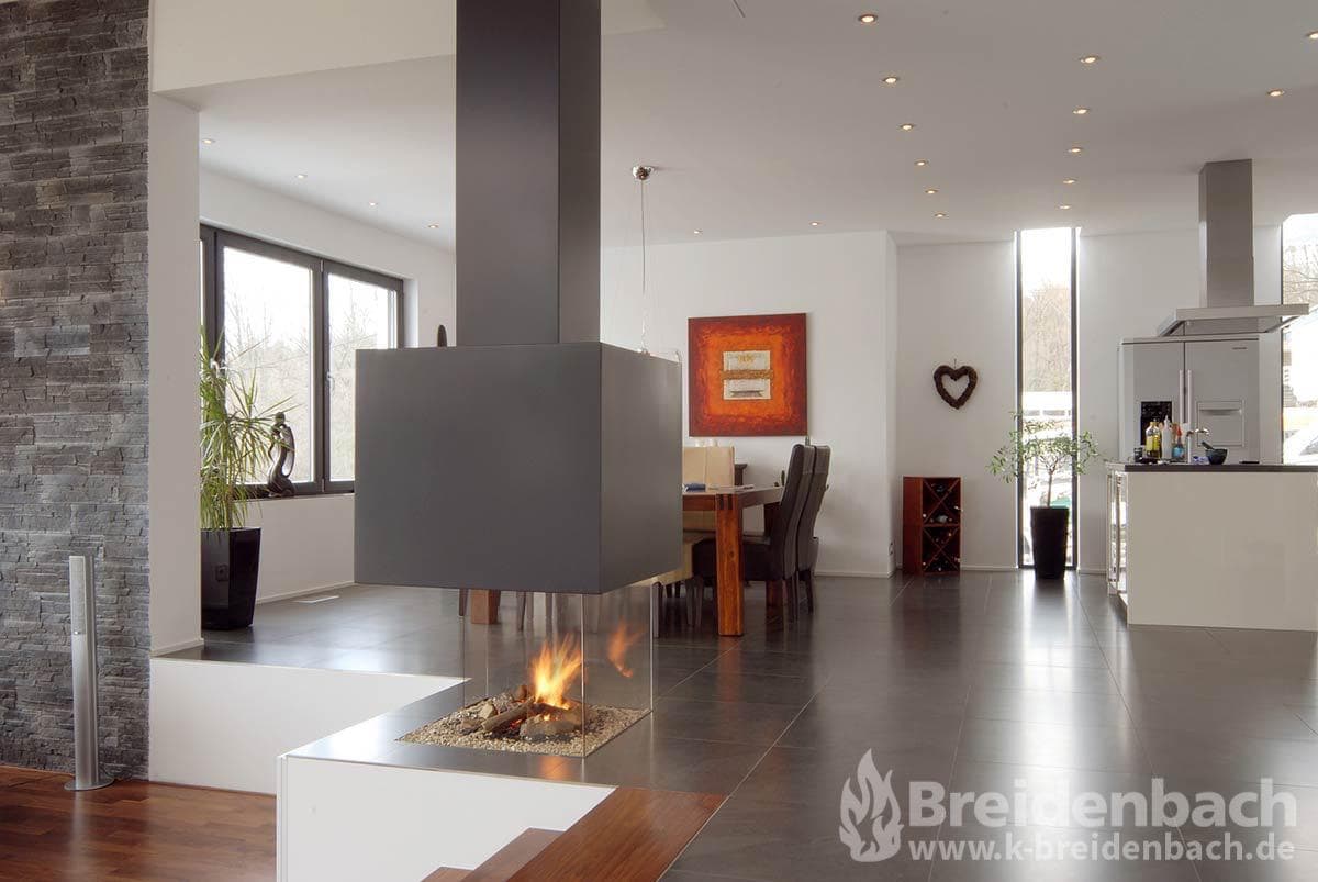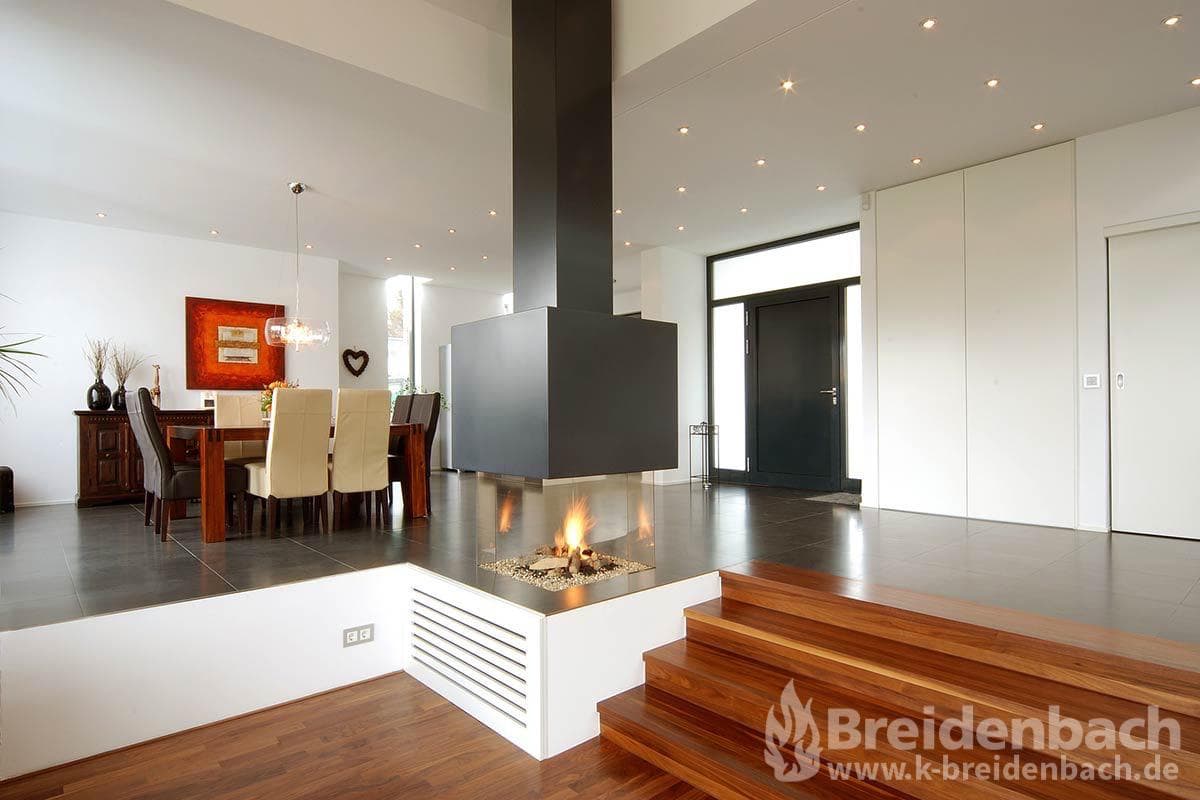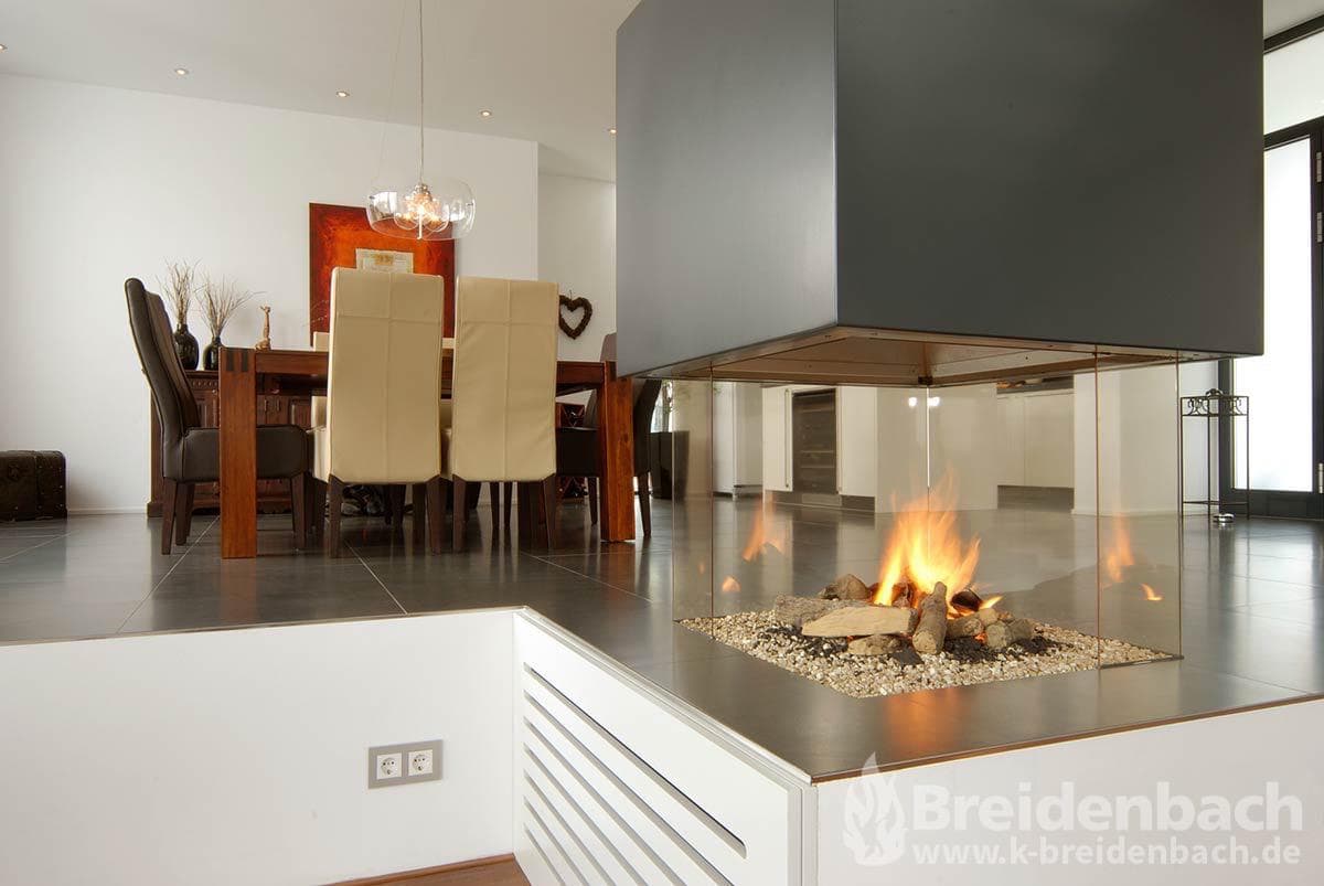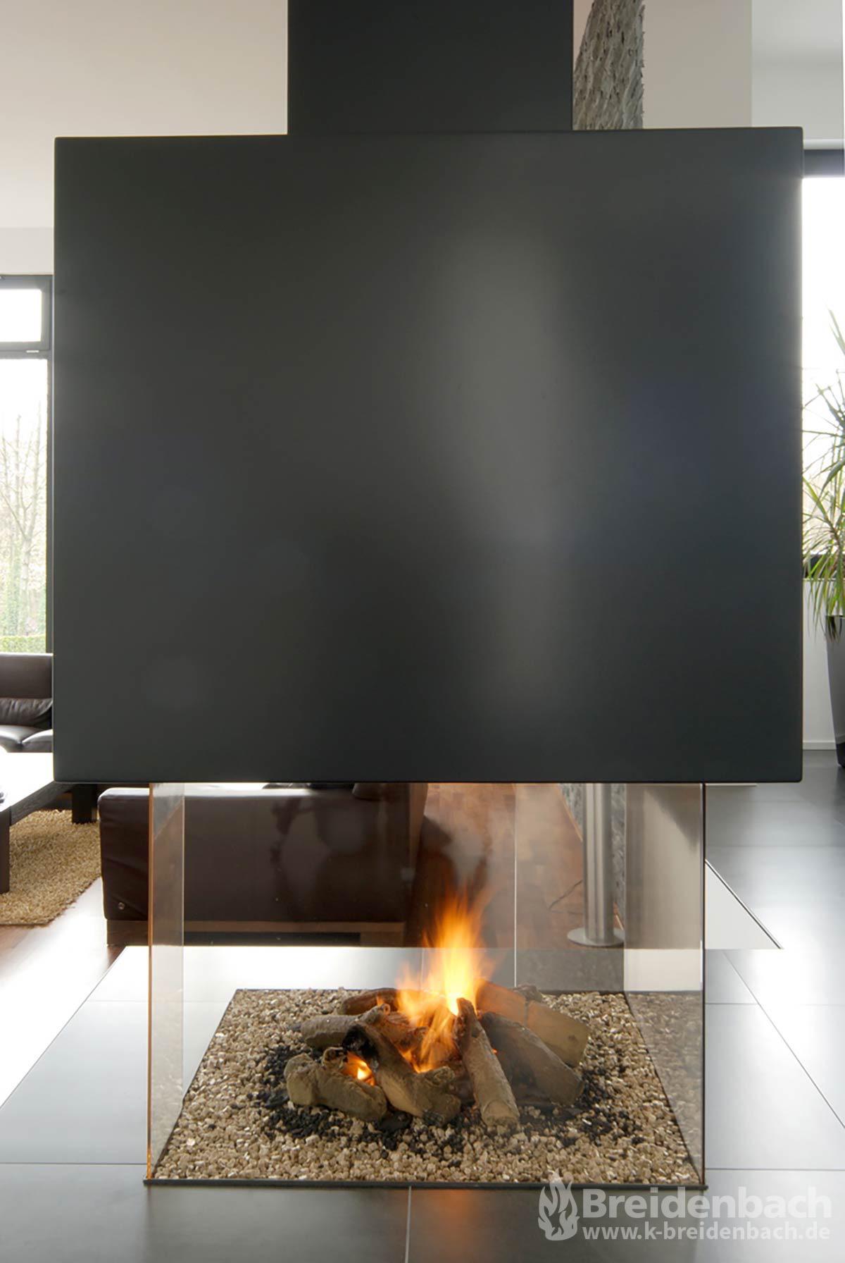 4-seitig offene Gaskaminanlage. An 3 Seiten mit Glas geschlossen.